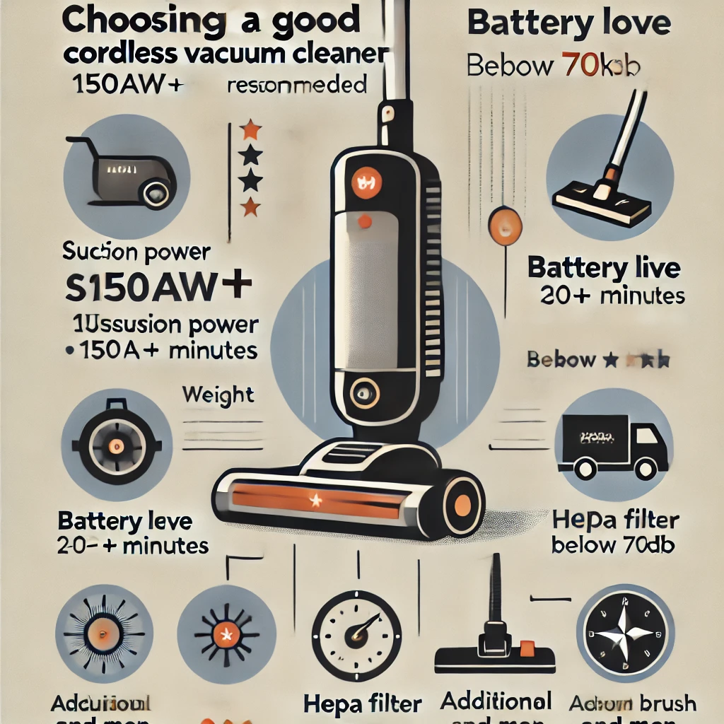 ✅ 흡입력이 충분한가? (150AW 이상 추천) ✅ 배터리 사용 시간이 넉넉한가? (40분 이상 추천) ✅ 무게가 적당한가? (2~3kg이 적당) ✅ HEPA 필터가 포함되어 있는가? ✅ 소음이 적어 사용하기 편한가? (70dB 이하 추천) ✅ 추가 브러쉬 및 물걸레 기능이 필요한가? ✅ 예산 대비 성능이 적절한가?